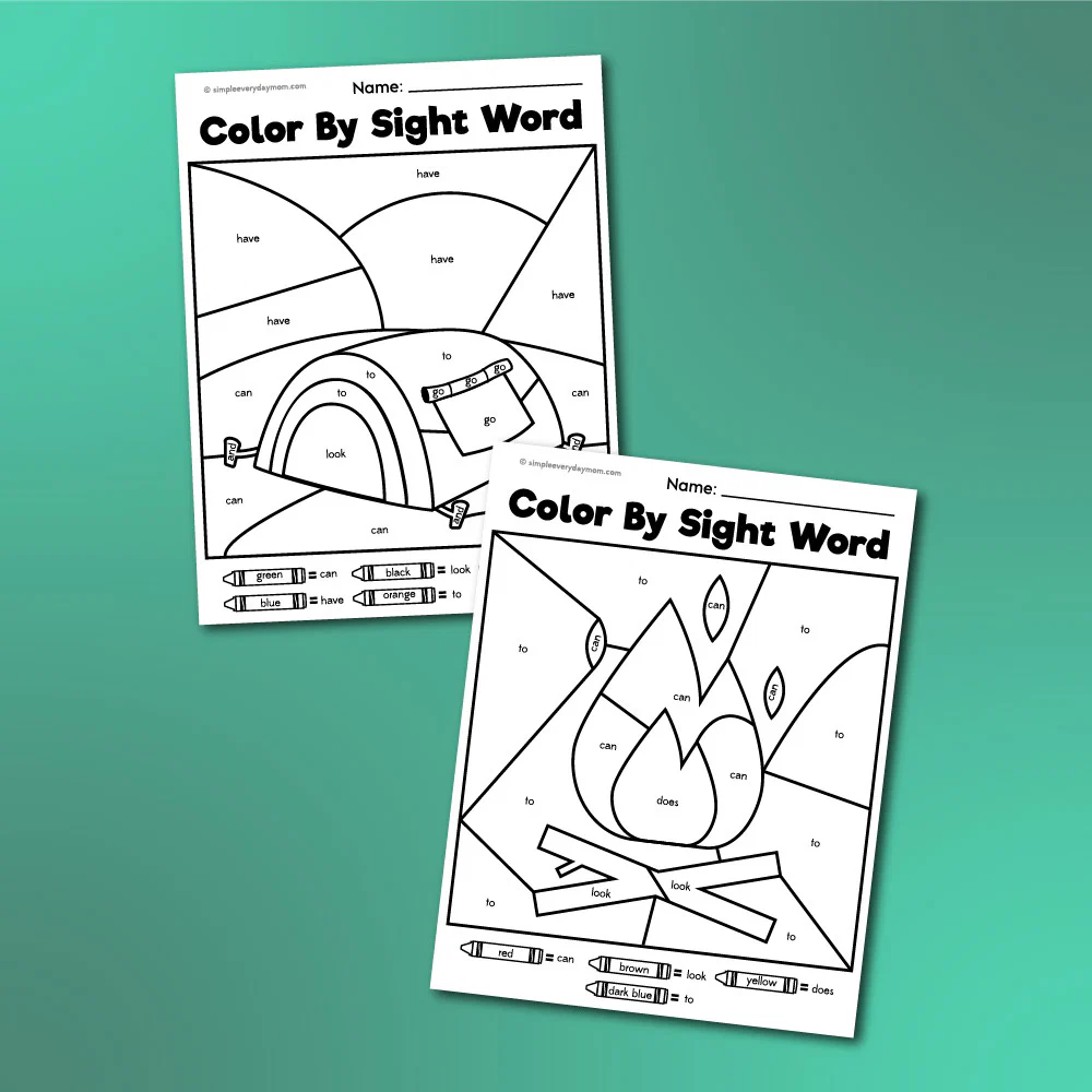 These camping color by sight word printables are a fun way to practice sight words with the kids.