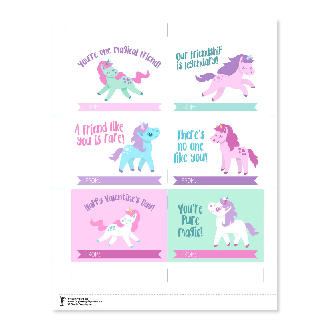 - 1 page of 6 unique unicorn valentines (sized at approximately 3.6"x2.75")